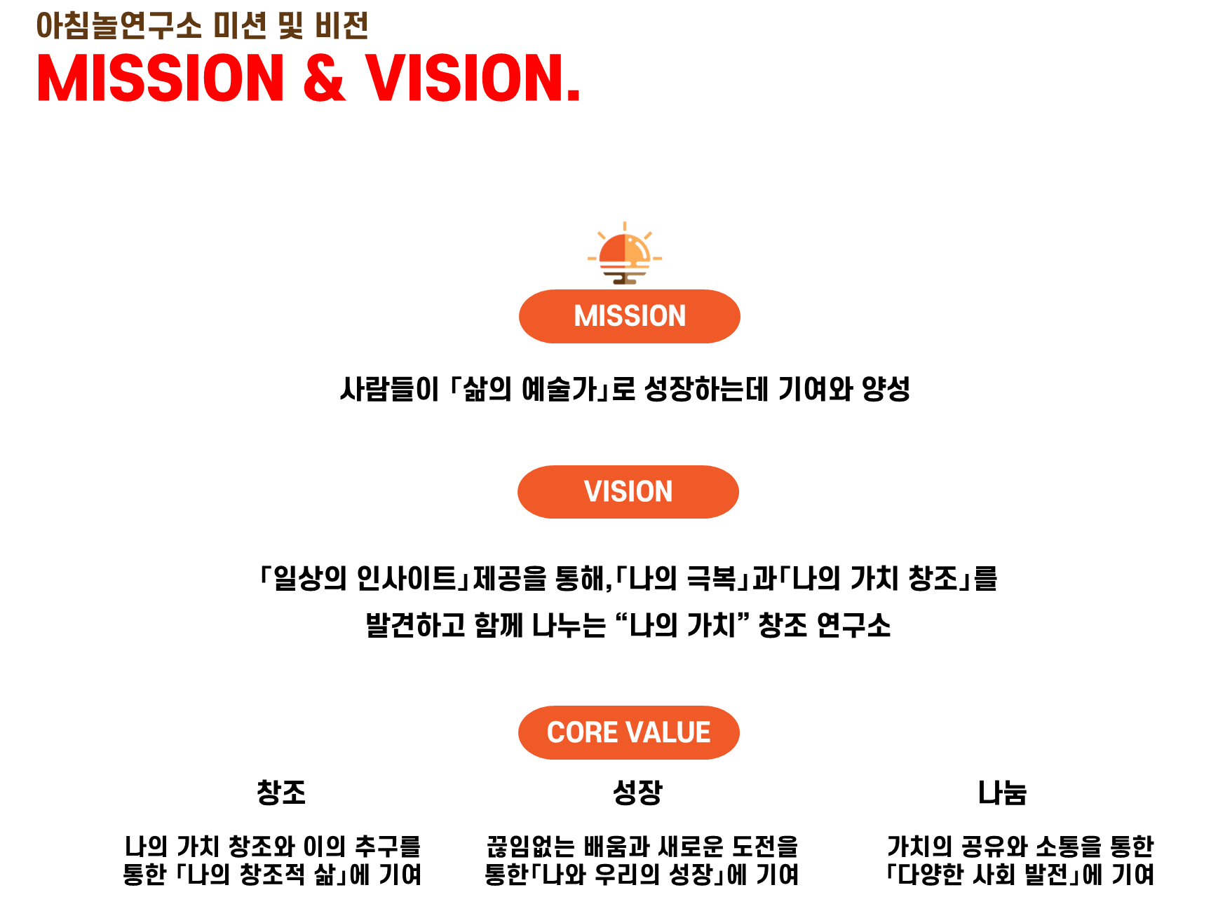 기업소개/Mission & Vision Mission & Vision by 아침놀연구소 2022. 8. 16. 공유하기 게시글 관리 아침놀연구소 - achimnol.com 저작자표시 비영리 변경금지 (새창열림) 댓글
